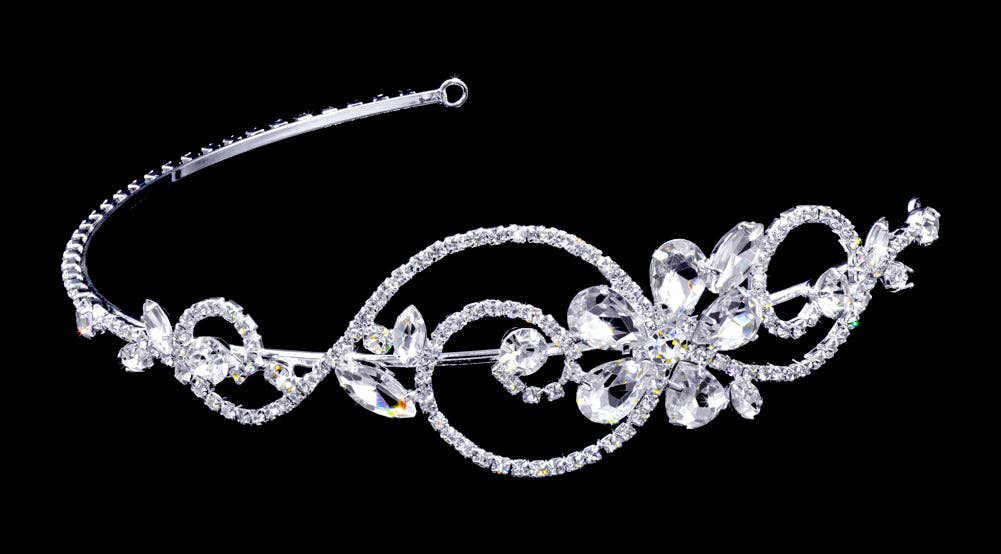 This headband is 1.75" wide and has rings and bobbie pins on the ends. Silver plated. Each piece is individually wrapped in plastic.