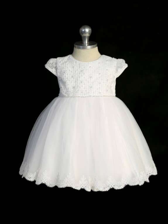 Baby Girls Baptism Dress with Cap Sleeved Embroidery Overlay Bodice with Organza Vest