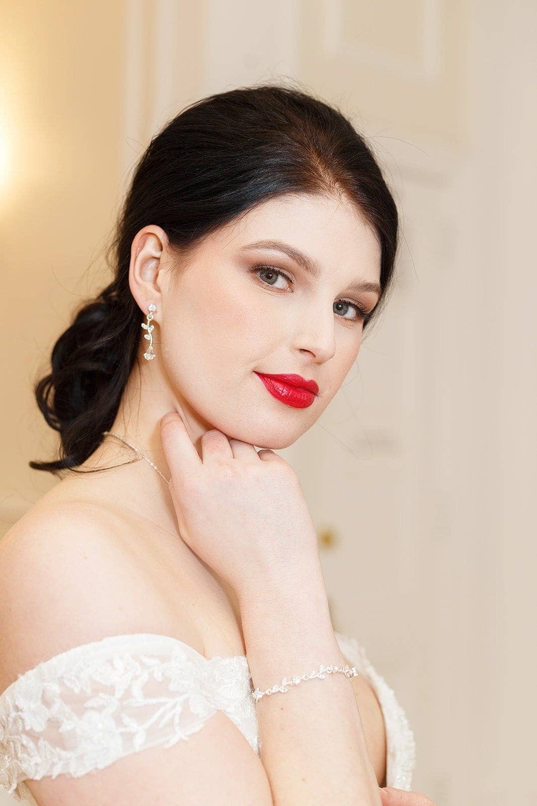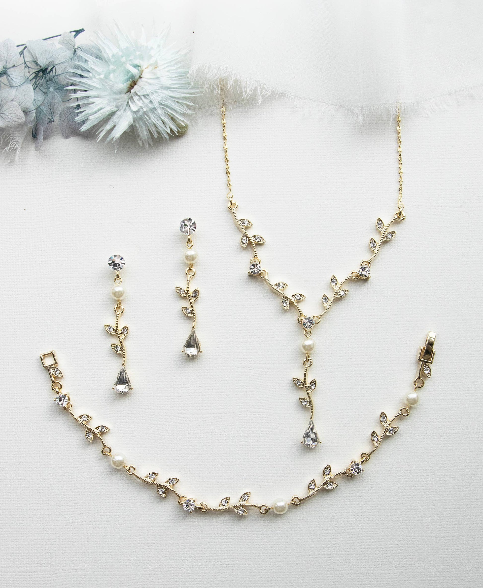 This brilliant gold jewelry set will surely add sparkle on your special day! Boasting brilliant rhinestones in a floral like vine design. Necklace measures 16" long and has an extender for additional length (up to 18"), earrings measure 1 3/4". Matching optional bracelet measures 7 1/2" long. Choose from silver, gold or rose gold. This set is perfect for the bride, bridesmaids, or any special occasion!