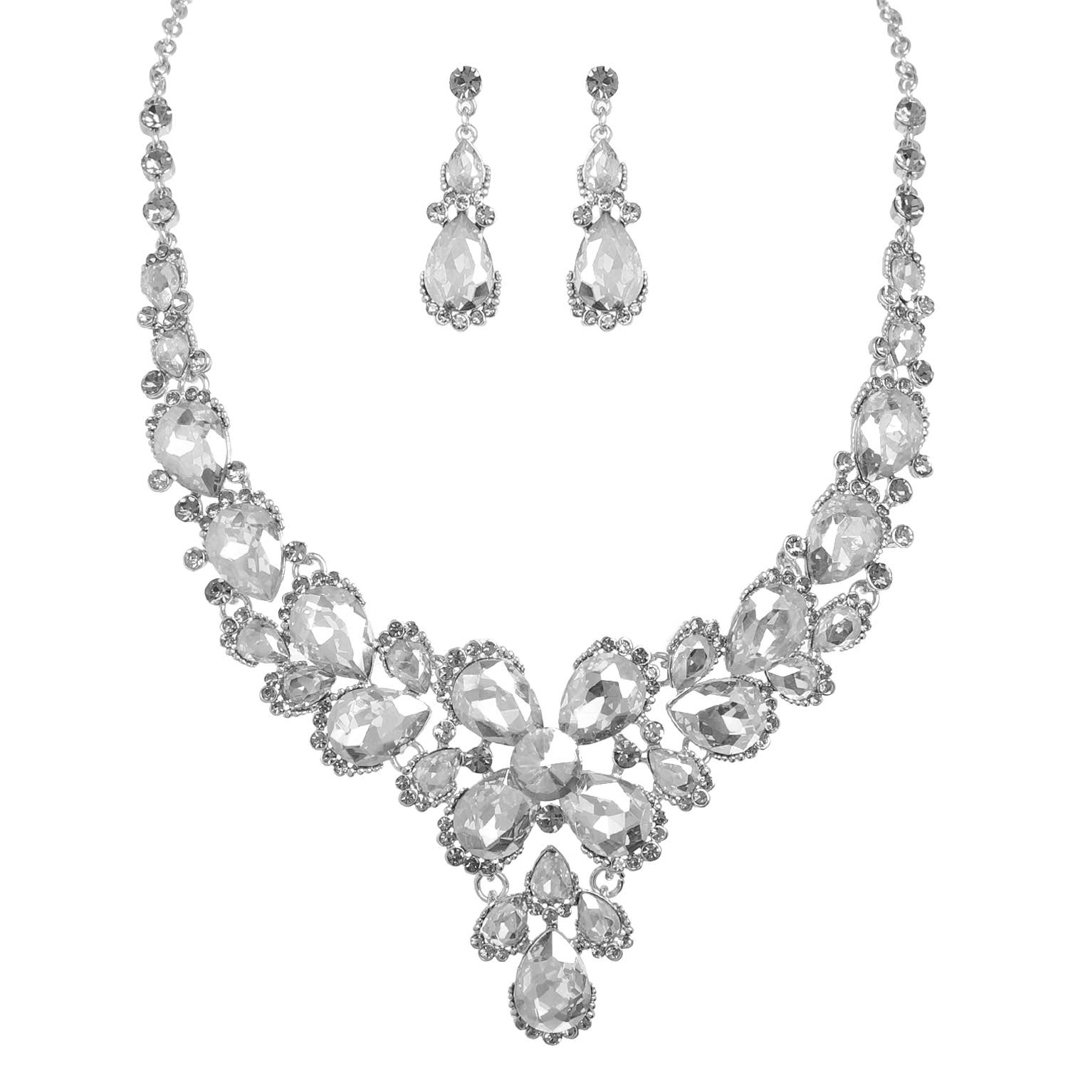 V-SHAPED CLUSTER STATEMENT EVENT FORMAL WEDDING BRIDAL PROM DRESSY EVENING COCKTAIL CRYSTAL RHINESTONE BLING GEMSTONE PAVE JEWELED DANGLE DROP EARRINGS ADJUSTABLE NECKLACE JEWELRY SET EARRING NECKLACE SET