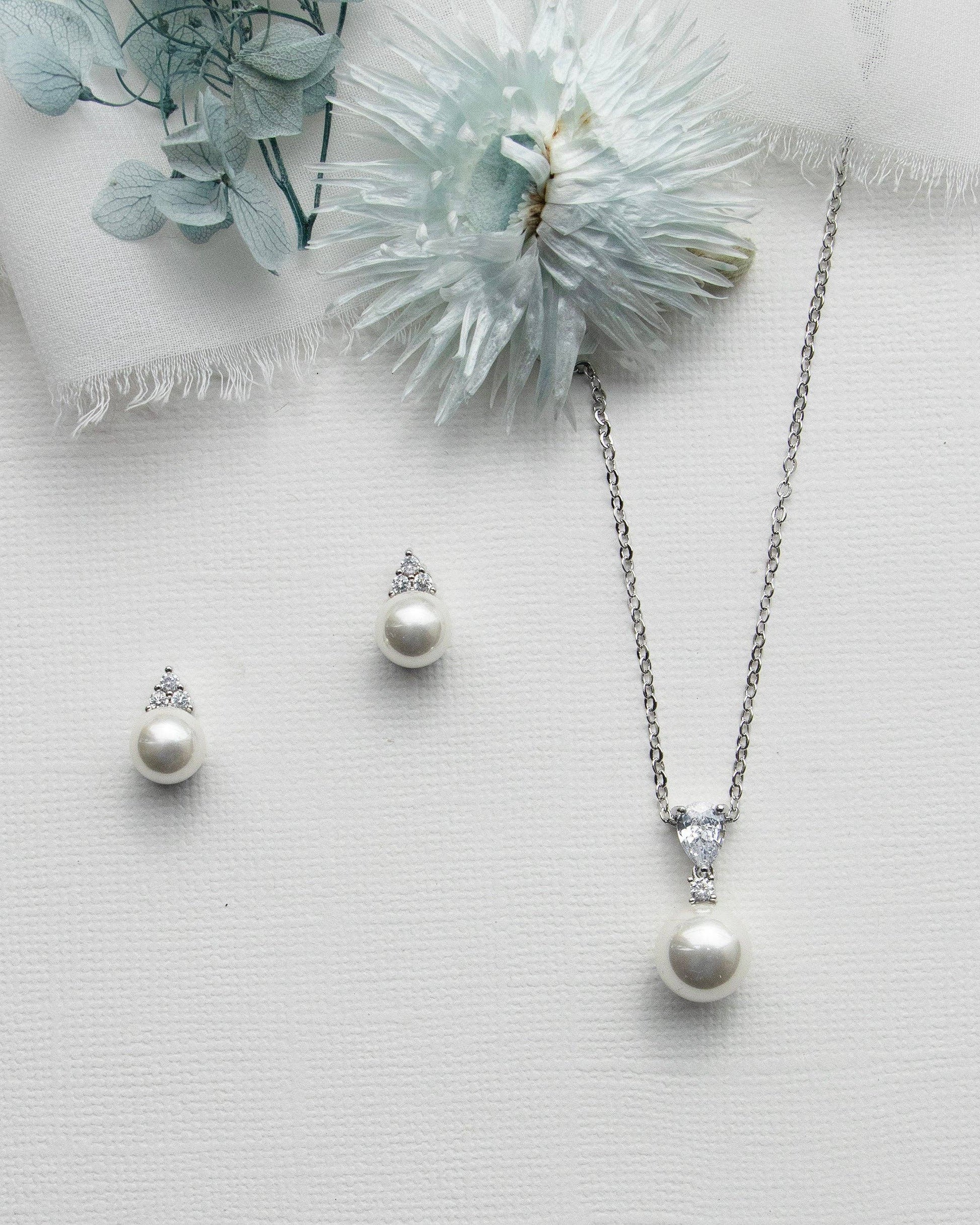 These dainty, minimalist jewelry set features 8mm glass pearls with tiny cubic zirconia accents. This jewelry set is a jewelry box staple! This necklace jewelry gift set would be perfect for the minimalist bride, bridesmaids, flower girl, weddings or any occasion! Earrings measure 1/4", necklace is adjustable from 16"-18" long. Matching optional bracelet completes the look and measures 7" long.
